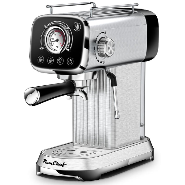 [Versatile Brewing Capabilities]Designed for flexibility, the coffee maker brews with both coffee pods and ground coffee. Whether you want one cup or two, the user-friendly interface allows easy selection. The integrated steam function lets you seamlessly steam milk or brew coffee. The built-in temperature gauge ensures perfect brewing and steaming by precisely controlling temperatures, delivering optimal coffee and steam quality for a perfect taste. You can create a cappuccino, latte or flat white at your home with our cappuccino maker.