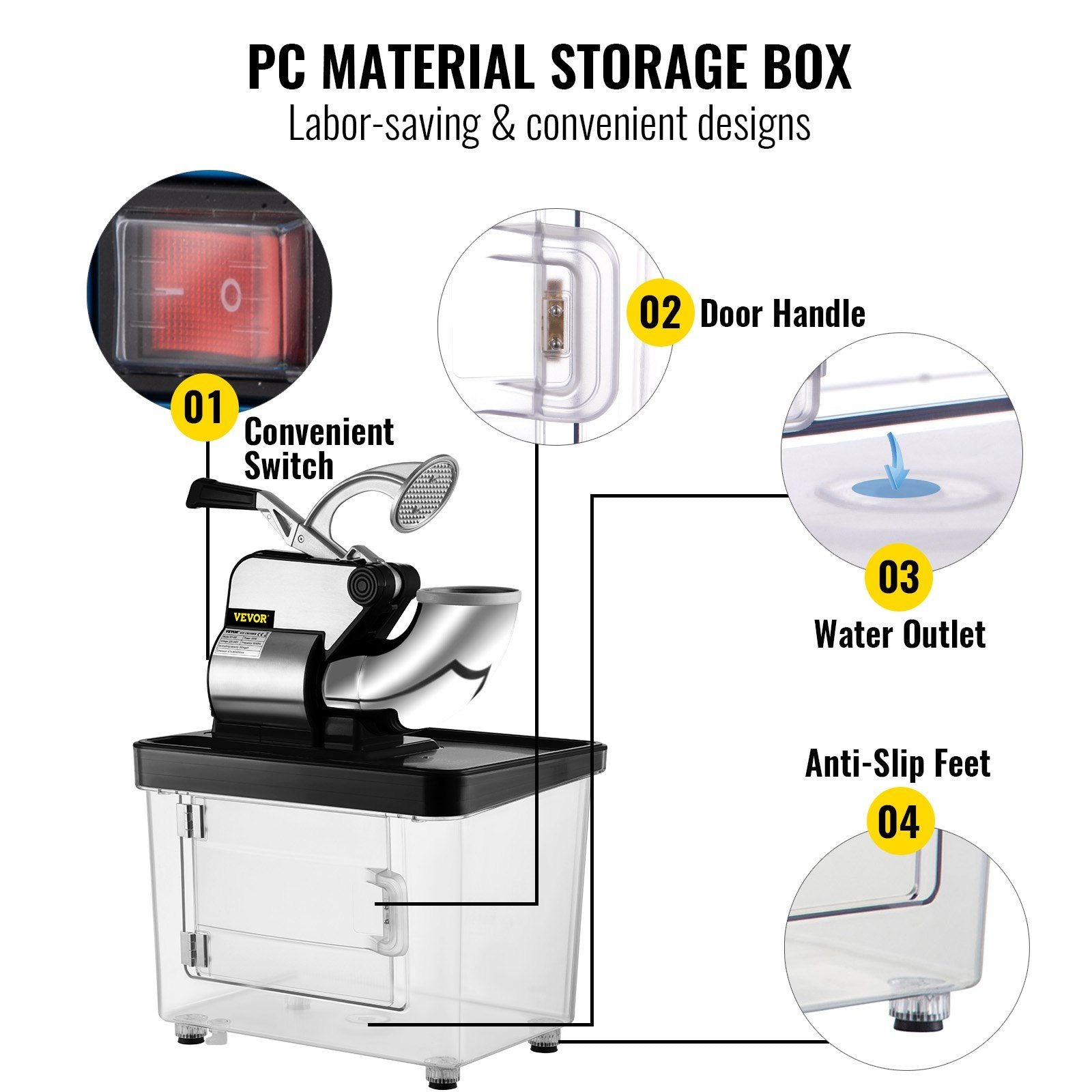 Integrated PC Storage Box: An extra-large PC storage box is integrated into our electric shaved ice machine, adopting the technique of one-piece injection moulding. It measures 18.5" (47 cm) long, 14.2" (36 cm) wide, 14.2" (36 cm) deep, and 0.2" (4 mm) thick, which is capable of holding around 9 Gal (34 L) of shaved snow ice. The thick case wall can keep the crushed ice inside frozen for longer, and the snow-ice won't splash everywhere for secure operation concerns.